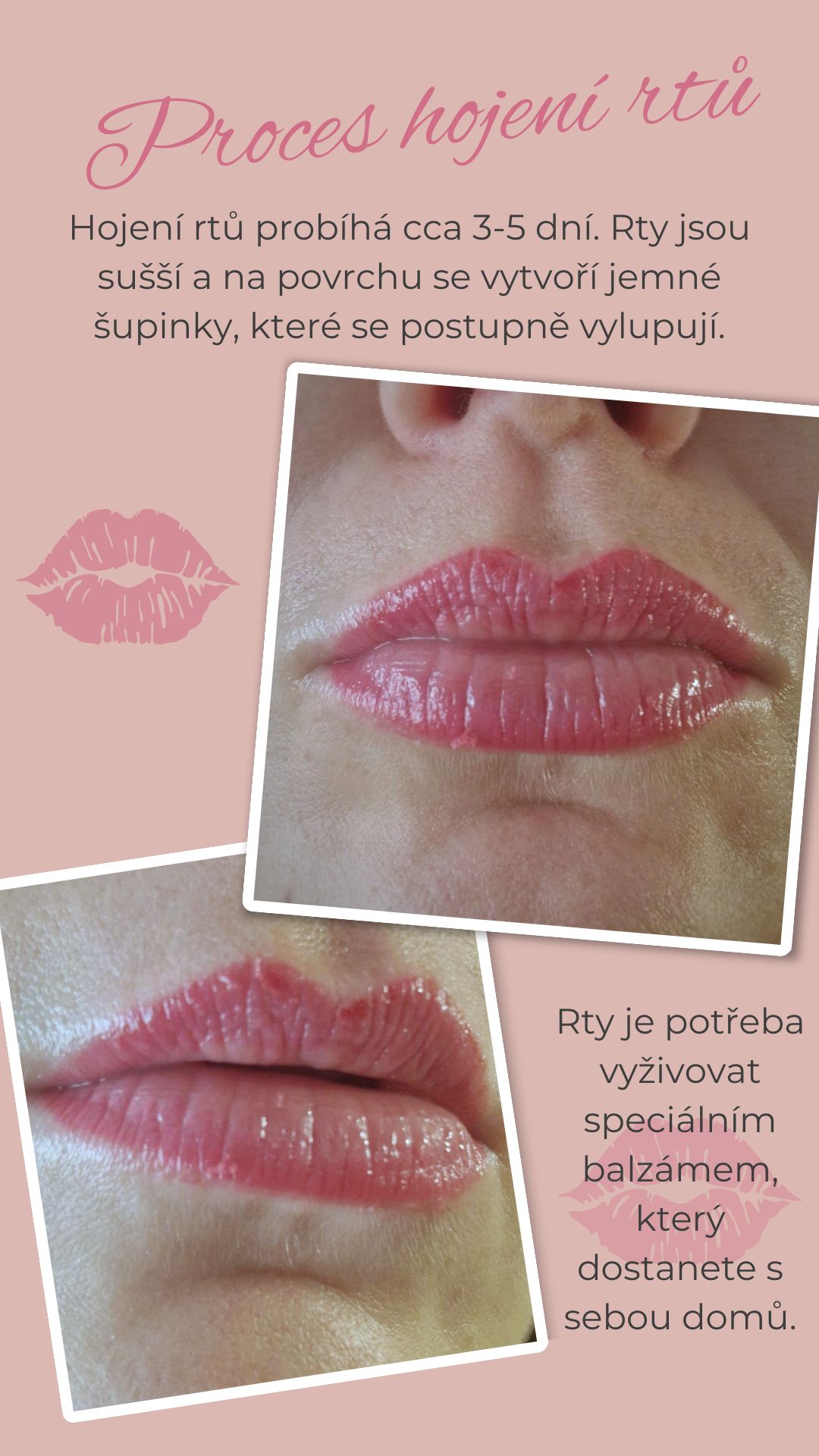 Vyhnout se slunci, soláriu, sauně a líbání minimálně 7 dní. Rty jemně mazat doporučeným balzámem, neškrábat stroupky.